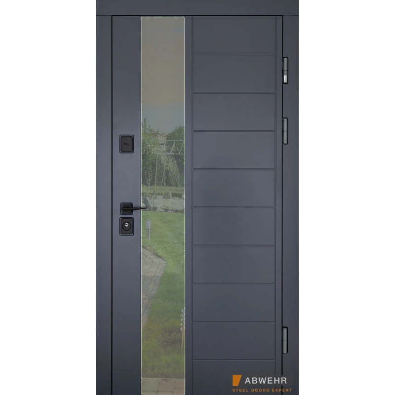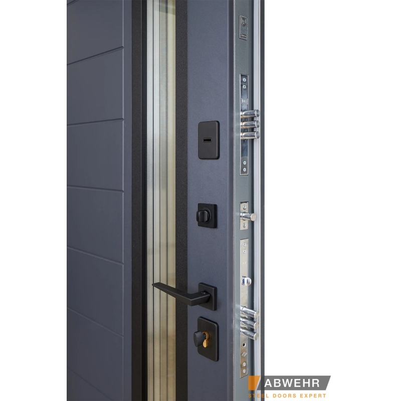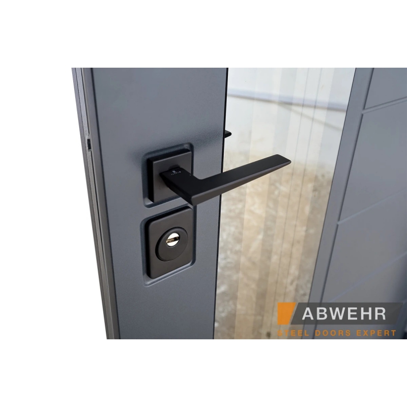 Фурнітура 3 зовнішні петлі, ручка на розетці чорна, броненакладки чорні верхні та нижні, поріг з нержавіючої сталі, нічник, антизрізи 4 шт, 3-х камерний склопакет
